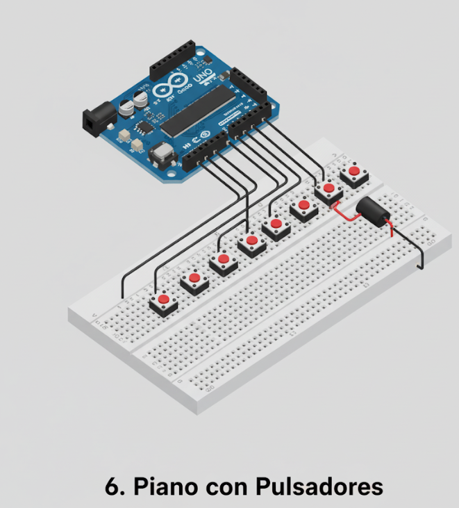 Este proyecto convierte tu Arduino en un pequeño instrumento musical. Cada pulsador que conectemos representará una nota musical. Al presionarlo, un zumbador (buzzer) piezoeléctrico emitirá el sonido correspondiente a esa nota. Es una forma fantástica de aprender sobre la función `tone()` de Arduino y sobre cómo funcionan las resistencias pull-up internas.