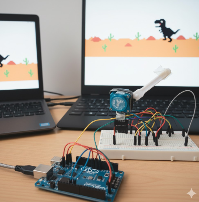 En este proyecto, unimos el mundo del software de alto nivel (Python) con el hardware (Arduino) para crear un bot que juega físcamente por nosotros al famoso juego del dinosaurio de Chrome.
