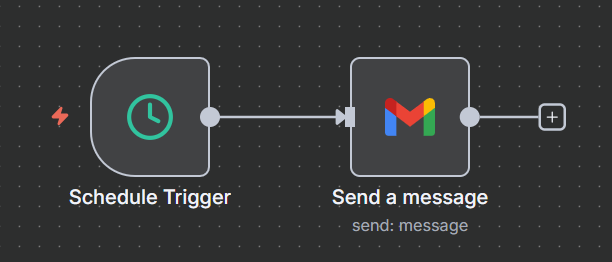 Para esta demostración, he creado un flujo muy básico pero increíblemente útil. ¿Mi objetivo? Que n8n envíe un correo a mi socio cada día recordándole que suba un vídeo a tiktok. Parece una tontería, pero calcula cuántos minutos al mes, o al año, te ahorras.